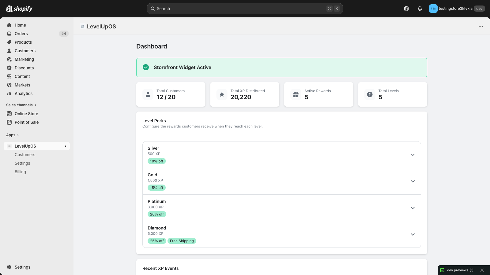 See total XP awarded, active customers, level distribution, and recent activity — all in one dashboard.