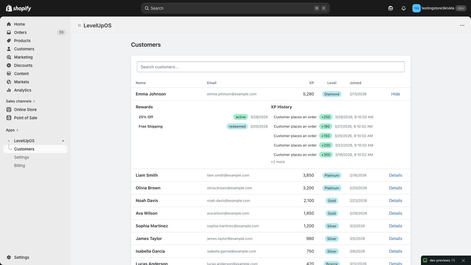 Track individual XP history, current level, earned rewards, and lifetime value for each customer.