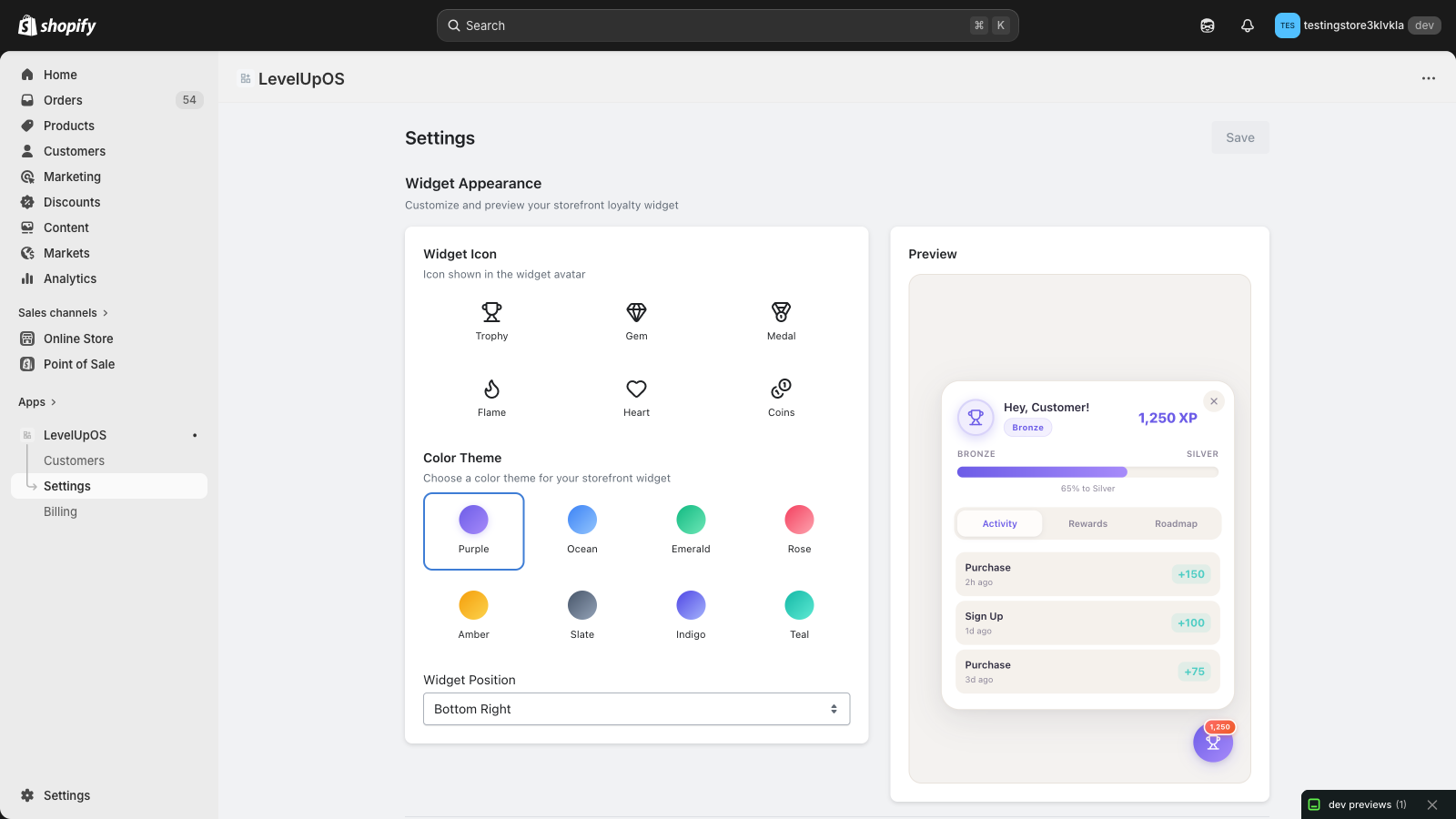 Customize colors, themes, and reward rules. Preview your storefront widget in real-time.